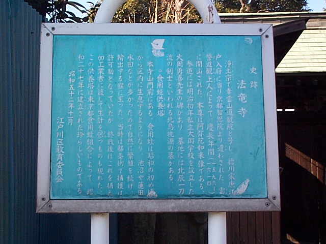 すいません。徳川家康以外名前知りません。大岡先生も、北辰一刀流の剣士も知りません。ごめんなさい。って誰に謝ってんだか。 東京都食用蛙組合はまだあるのかなあ。多分ないだろうな。いや絶対ないな。とするとこの供養塔の管理は誰がすべきでしょうかね? 「史跡」と銘打つくらいだから、やっぱり江戸川区がきちんと保存に乗り出すべきでしょう。珍しいものならもうちょっとねえ。何とかしてください。もう字が消えるのも時間の問題だって。看板だって字が消えかかってるくらいだから。重文指定とかどうでしょう? |